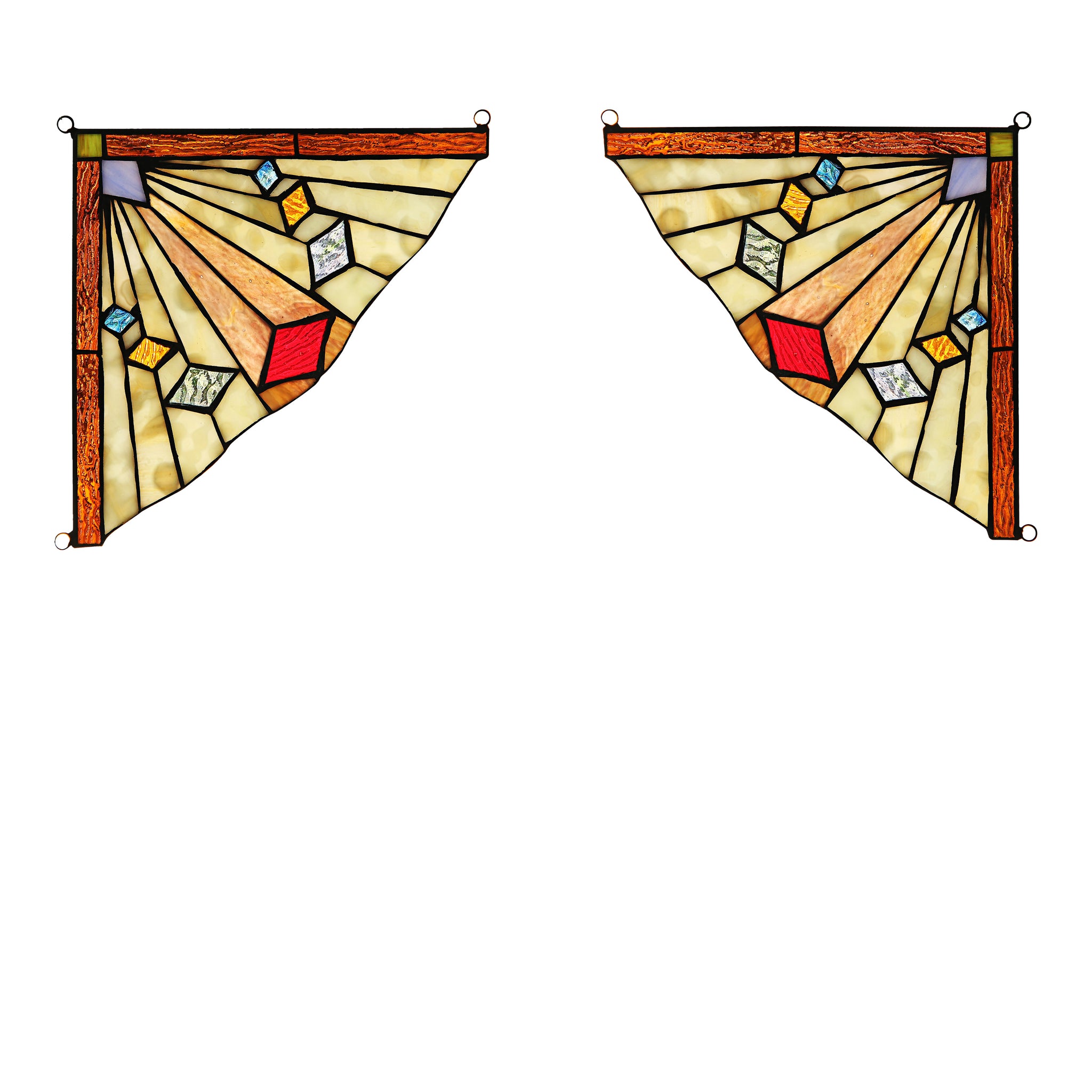 This is a pair of Mission style stained glass window panels, featuring a timeless design that will compliment your home. Hand crafted from over 35 pieces of art glass each. Main colors are red and yellow. Handcrafted using the same techniques that were developed by Louis Comfort Tiffany in the early 1900s, these beautiful Tiffany-style pieces contain hand-cut pieces of stained glass, each wrapped in fine copper foil. Thank you for choosing Radiance Goods, proudly serving you from the US!