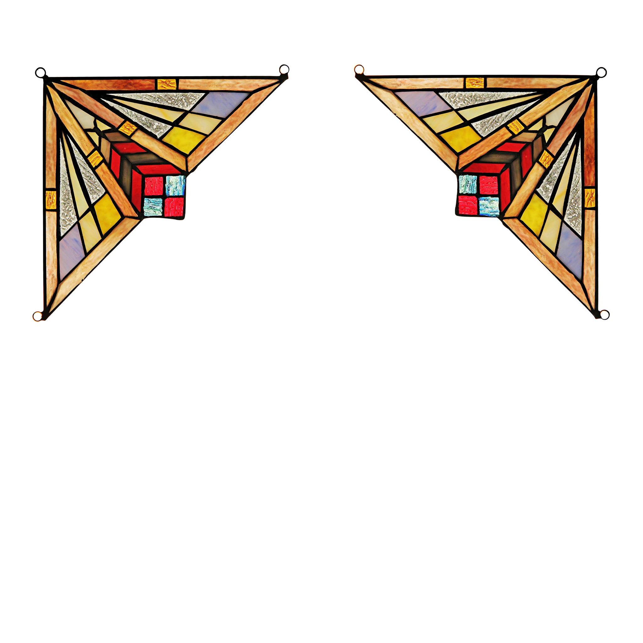 This is a pair of Mission style stained glass window panels, featuring a beautiful design that will compliment your home. Handcrafted from over 40 pieces of art glass each. Main colors are yellow and red. Handcrafted using the same techniques that were developed by Louis Comfort Tiffany in the early 1900s, these beautiful Tiffany-style pieces contain hand-cut pieces of stained glass, each wrapped in fine copper foil. Thank you for choosing Radiance Goods, proudly serving you from the US!
