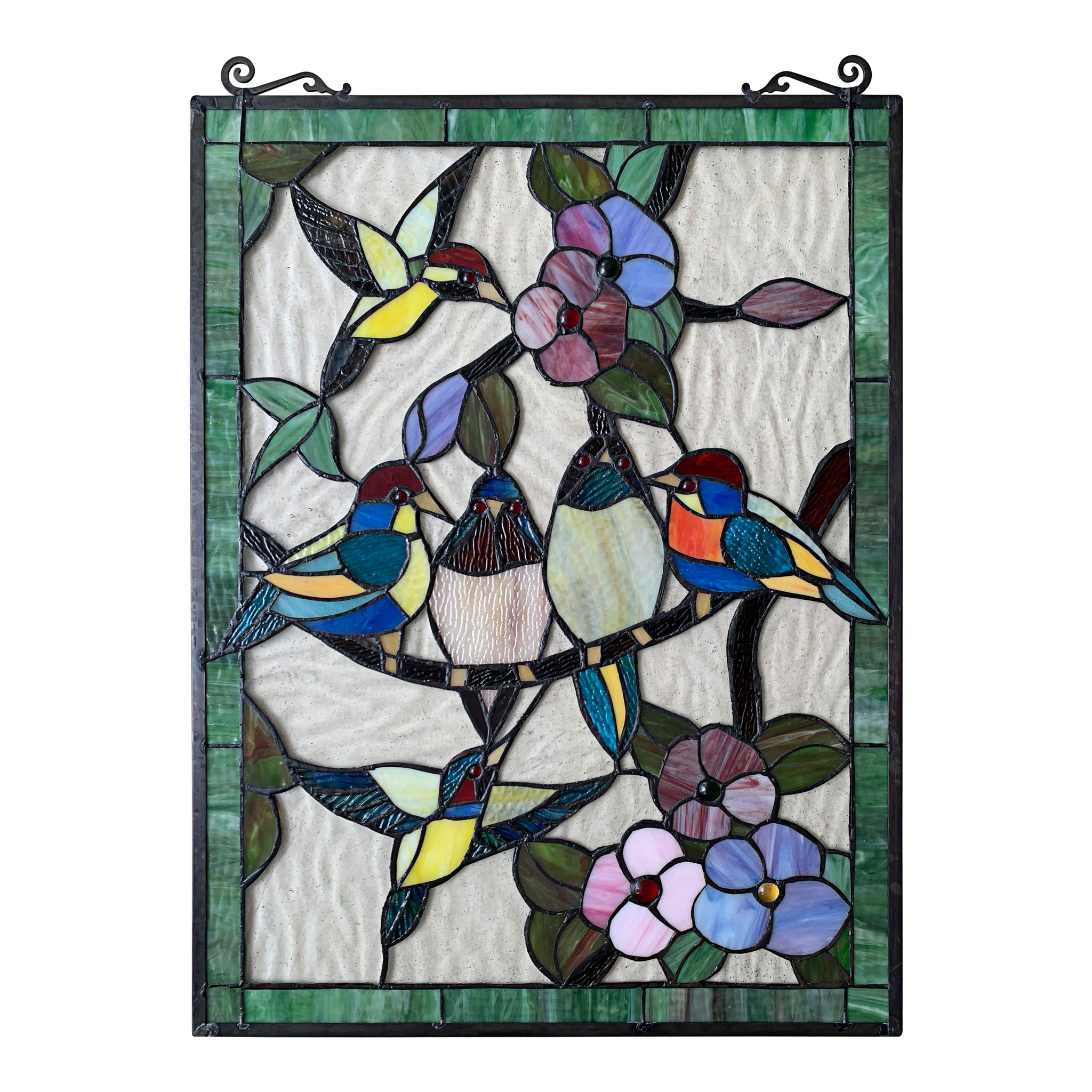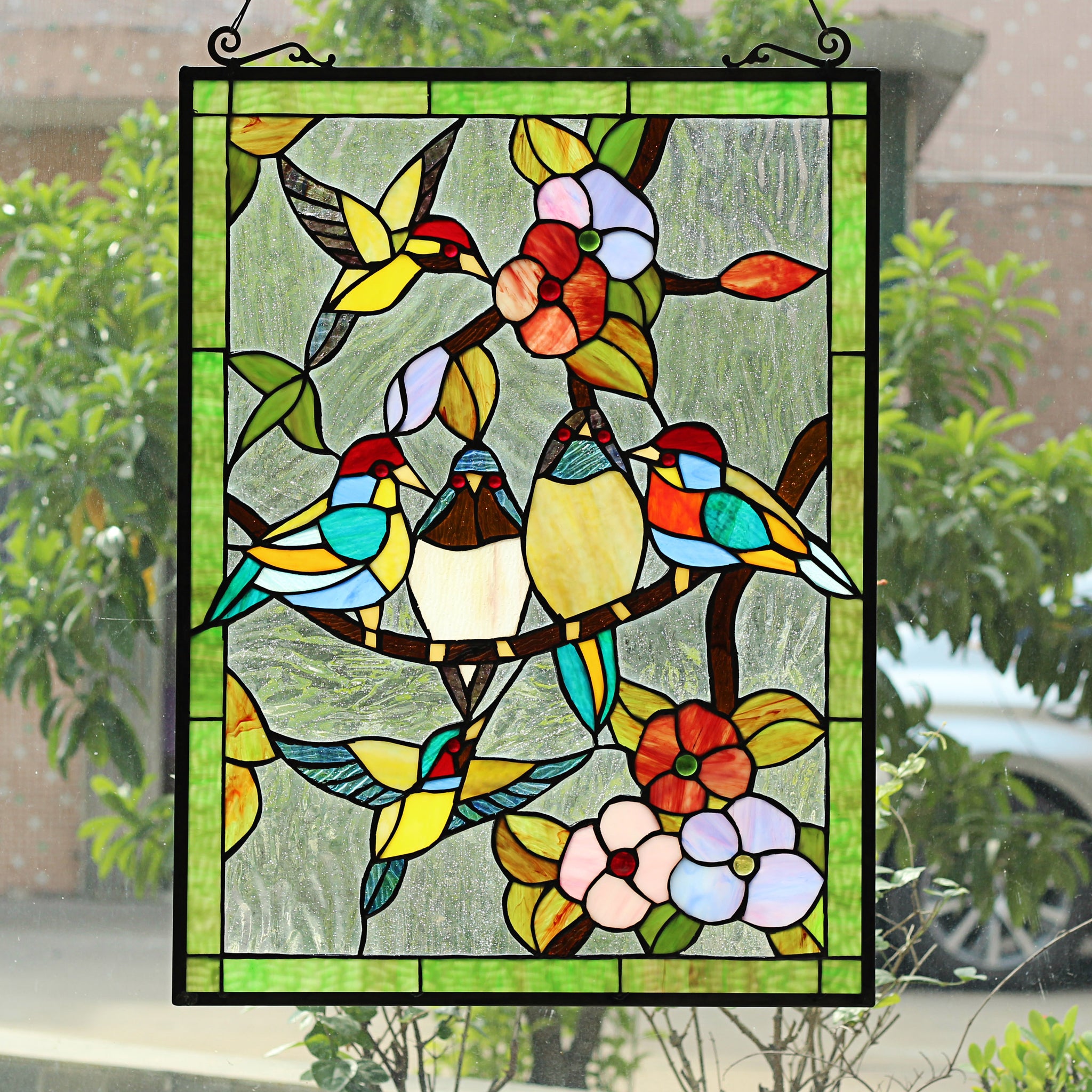 This is a gorgeous tropical birds sitting on a vine piece, and would be a beautiful addition to your home. This piece is created by over 200 pieces of hand cut, stained art glass, and 13 glass beads. Handcrafted using the same techniques that were developed by Louis Comfort Tiffany in the early 1900s, this beautiful Tiffany-style piece contains hand-cut pieces of stained glass, each wrapped in fine copper foil and soldered using high heat. Dry listed and recommended indoor use only. Each panel is unique, and is sure to catch everyone's eye with it's gorgeous colors. Thank you for choosing Radiance Goods, proudly serving you from the US!