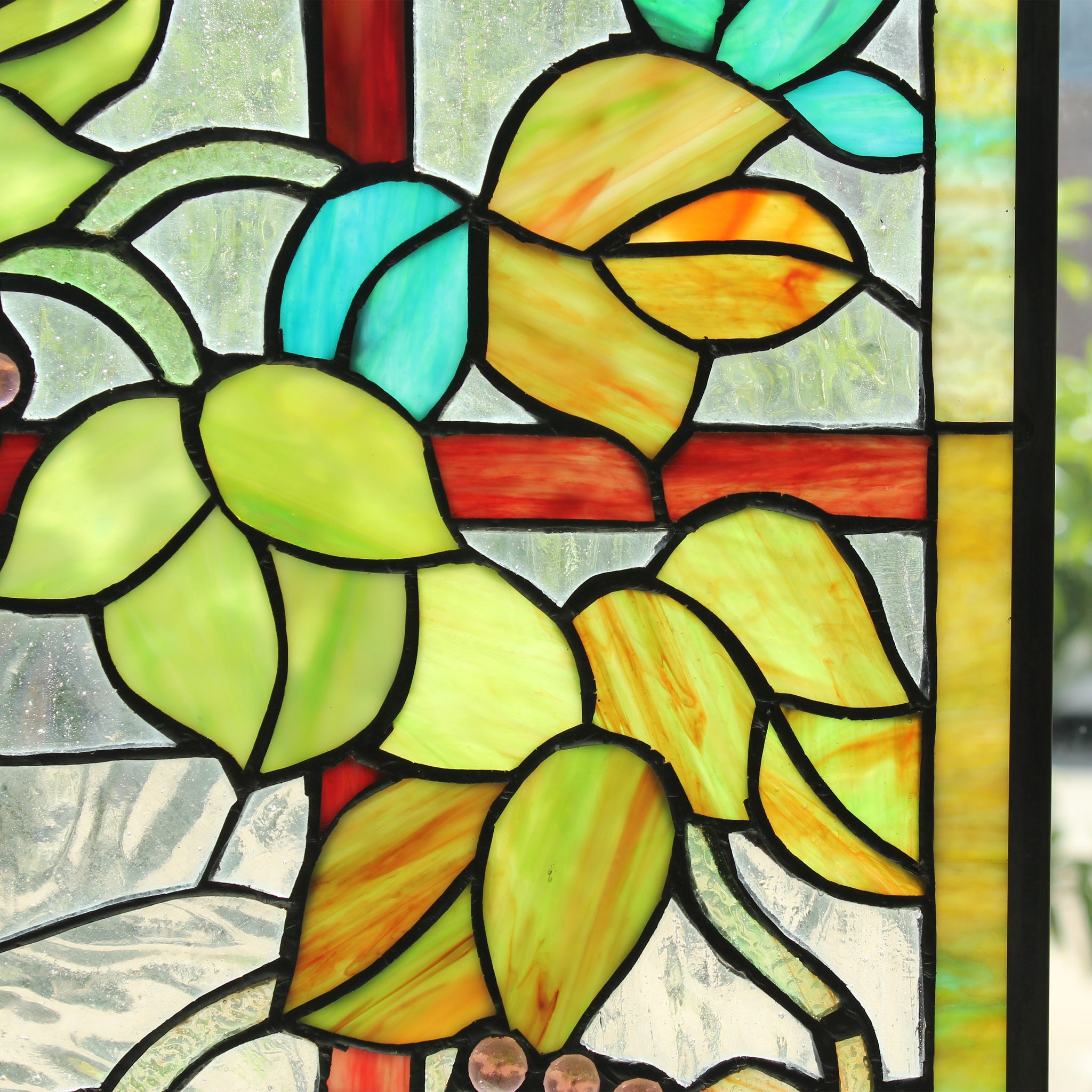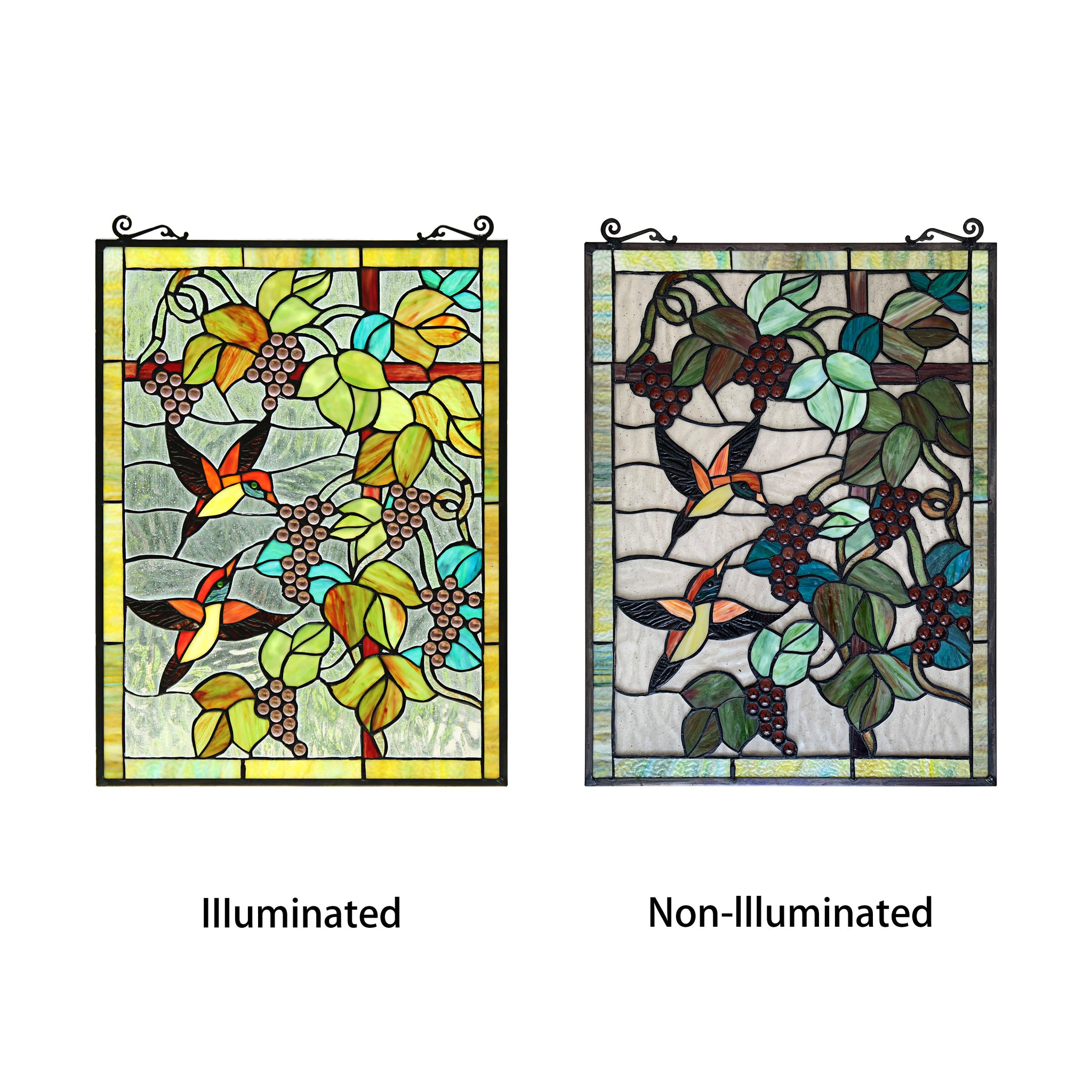 Add beauty to your home with this breath taking window panel, featuring two humming birds, each eating grapes, straight from the vine! This delightful piece is handcrafted by over 200 pieces of hand cut stained art glass and 84 glass beads. Handcrafted using the same techniques that were developed by Louis Comfort Tiffany in the early 1900s, this beautiful Tiffany-style piece contains hand-cut pieces of stained glass, each wrapped in fine copper foil and soldered using high heat. Dry listed and recommended indoor use only. Each panel is unique, and is sure to catch everyone's eye with it's gorgeous colors. Thank you for choosing Radiance Goods, proudly serving you from the US!