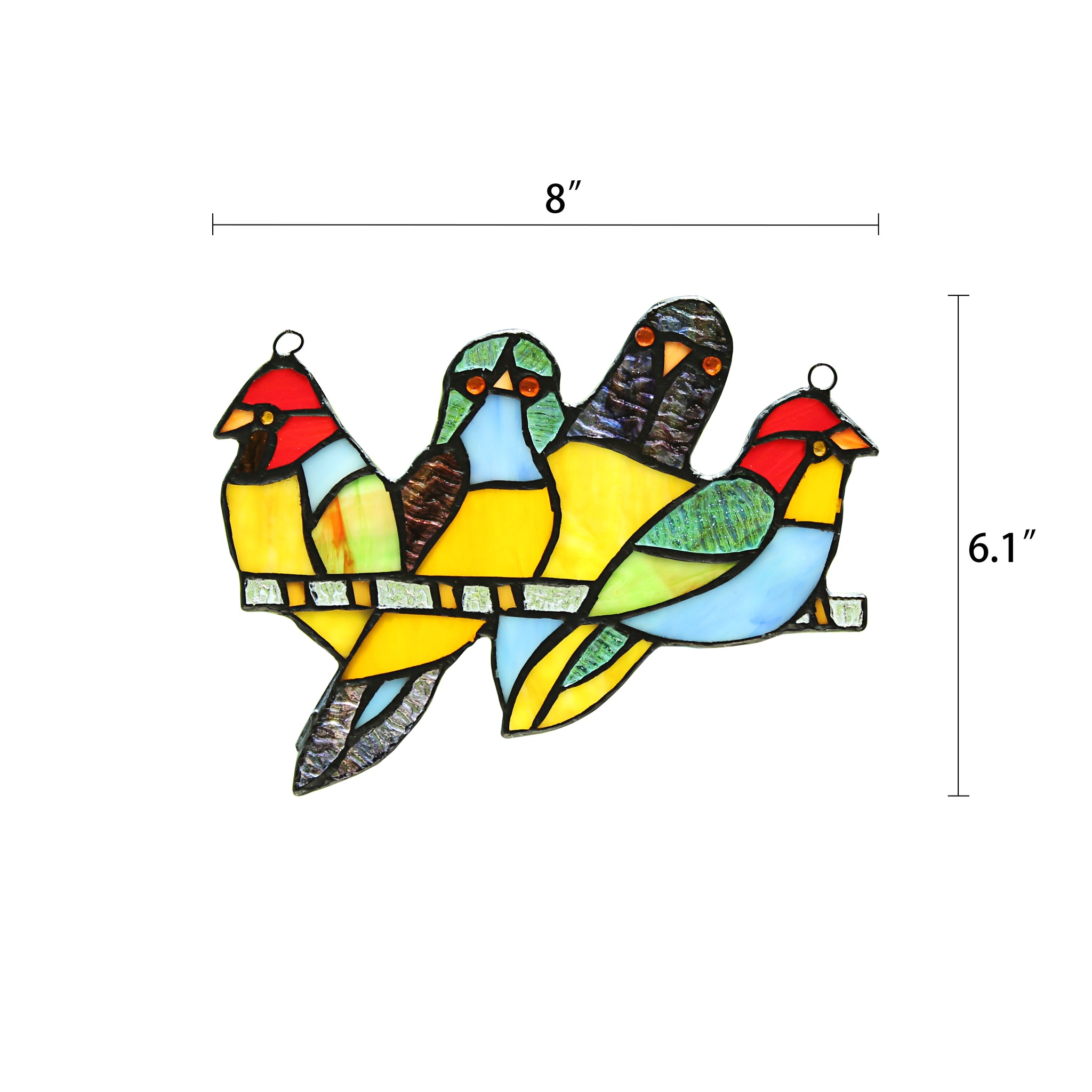 This animal style stained glass window panel features 4 birds, perched together in a line; colors consisting of orange, blue and many other colors. This piece is hand crafted from over 45 pieces of hand cut, stained art glass and 6 colorful glass beads. Handcrafted using the same techniques that were developed by Louis Comfort Tiffany in the early 1900s, this beautiful Tiffany-style piece contains hand-cut pieces of stained glass, each wrapped in fine copper foil and soldered using high heat. Dry listed and recommended indoor use only. Thank you for choosing Radiance Goods, proudly serving you from the US!