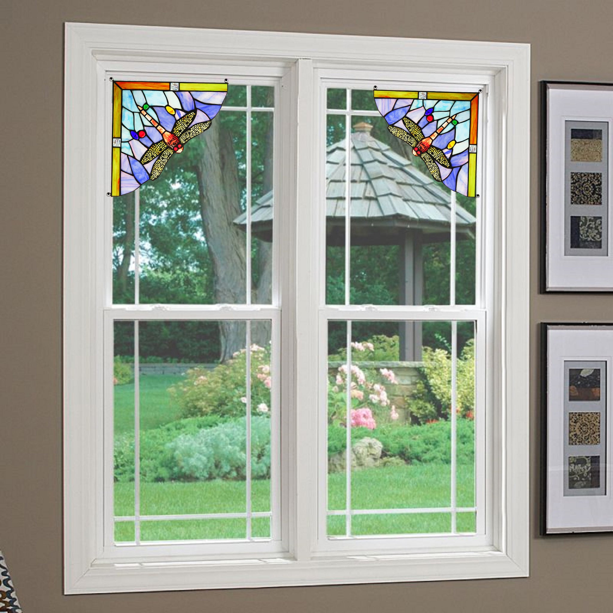 This Dragonfly style stained glass window panel features a gorgeously vibrant design that will brighten up your home. Hand crafted from 40 pieces of art glass and 6 glass beads. Main colors are purple and yellow. Handcrafted using the same techniques that were developed by Louis Comfort Tiffany in the early 1900s, this beautiful Tiffany-style piece contains hand-cut pieces of stained glass, each wrapped in fine copper foil and soldered using high heat. Dry listed and recommended indoor use only. Thank you for choosing Radiance Goods, proudly serving you from the US!