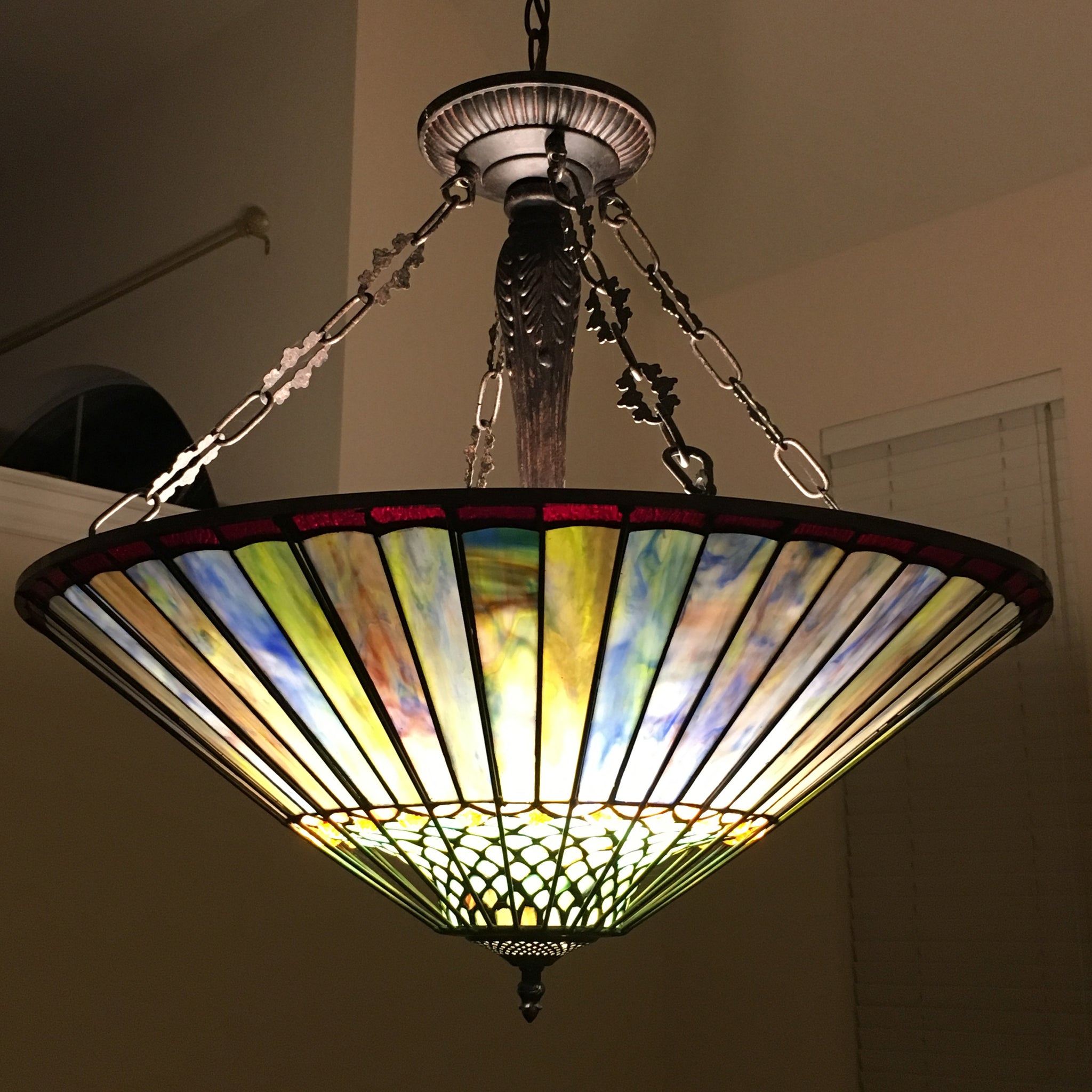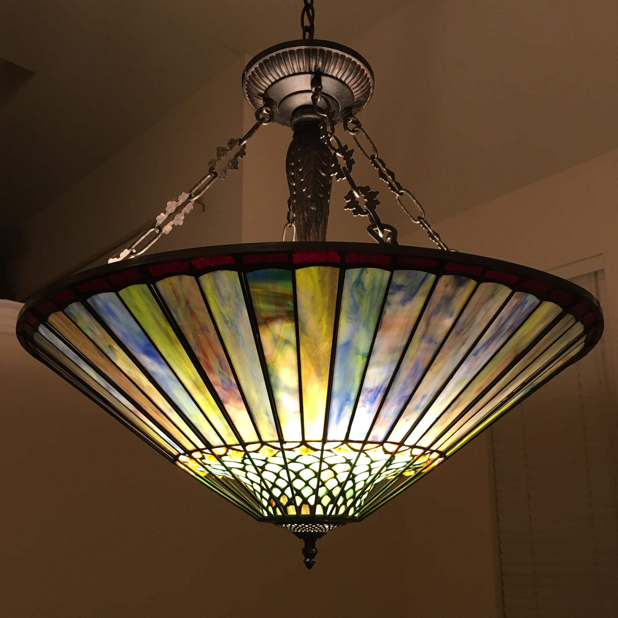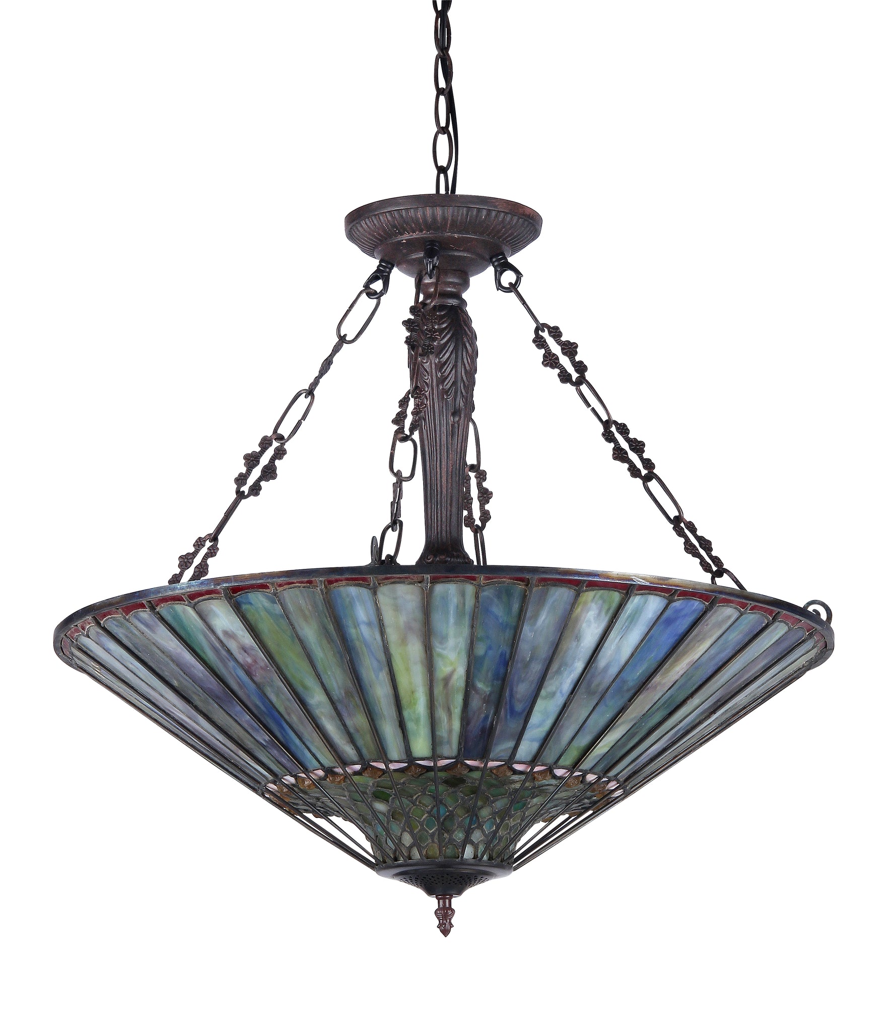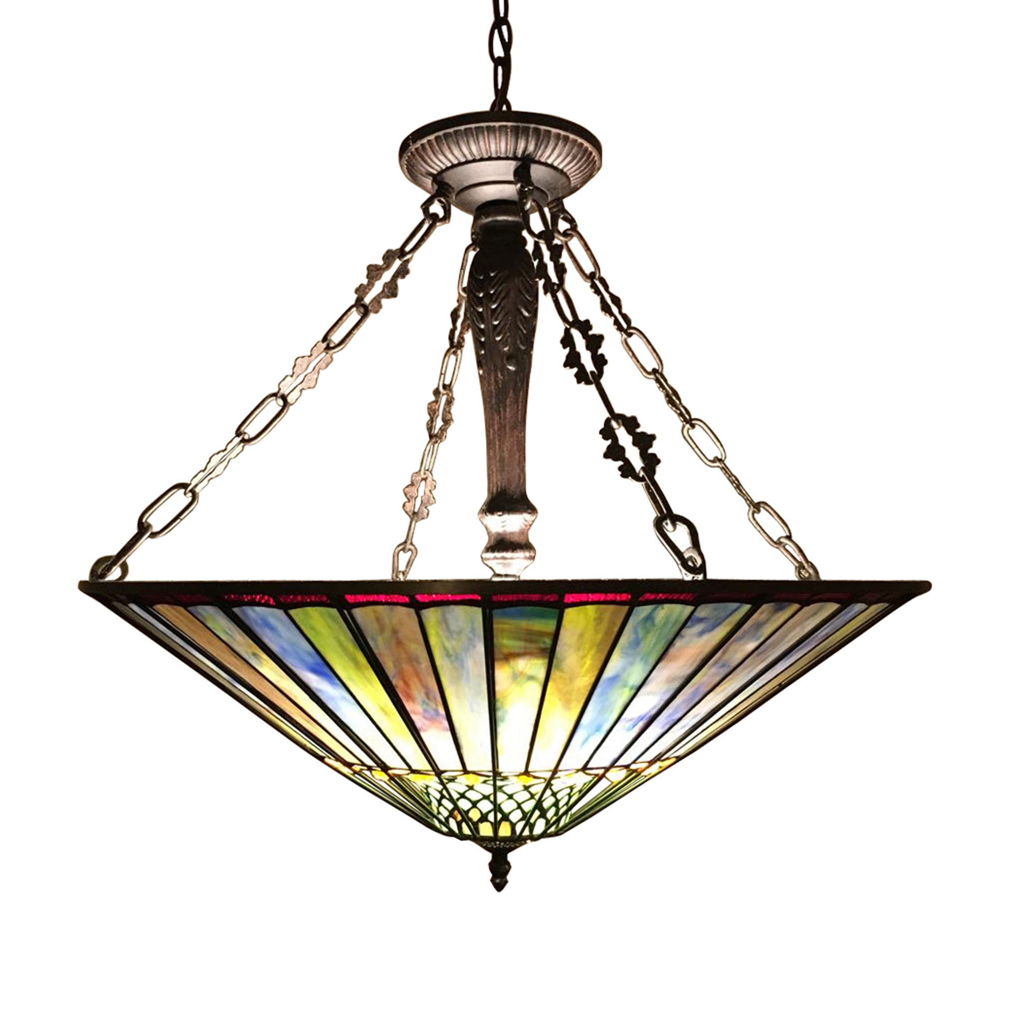 This geometric inverted hanging lamp has the style and colors to enhance any décor. Expertly handcrafted with top quality materials including real stained glass. It is finished in an antique bronze patina. Handcrafted using the same techniques that were developed by Louis Comfort Tiffany in the early 1900s, this beautiful Tiffany-style piece contains hand-cut pieces of stained glass, each wrapped in fine copper foil and soldered using high heat. Dry listed and recommended indoor use only.