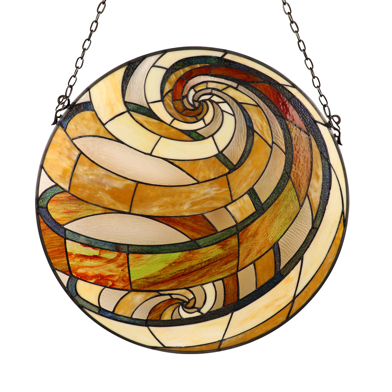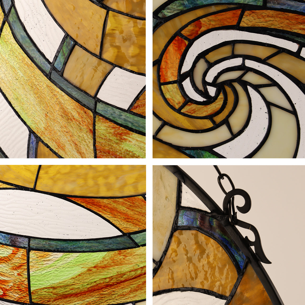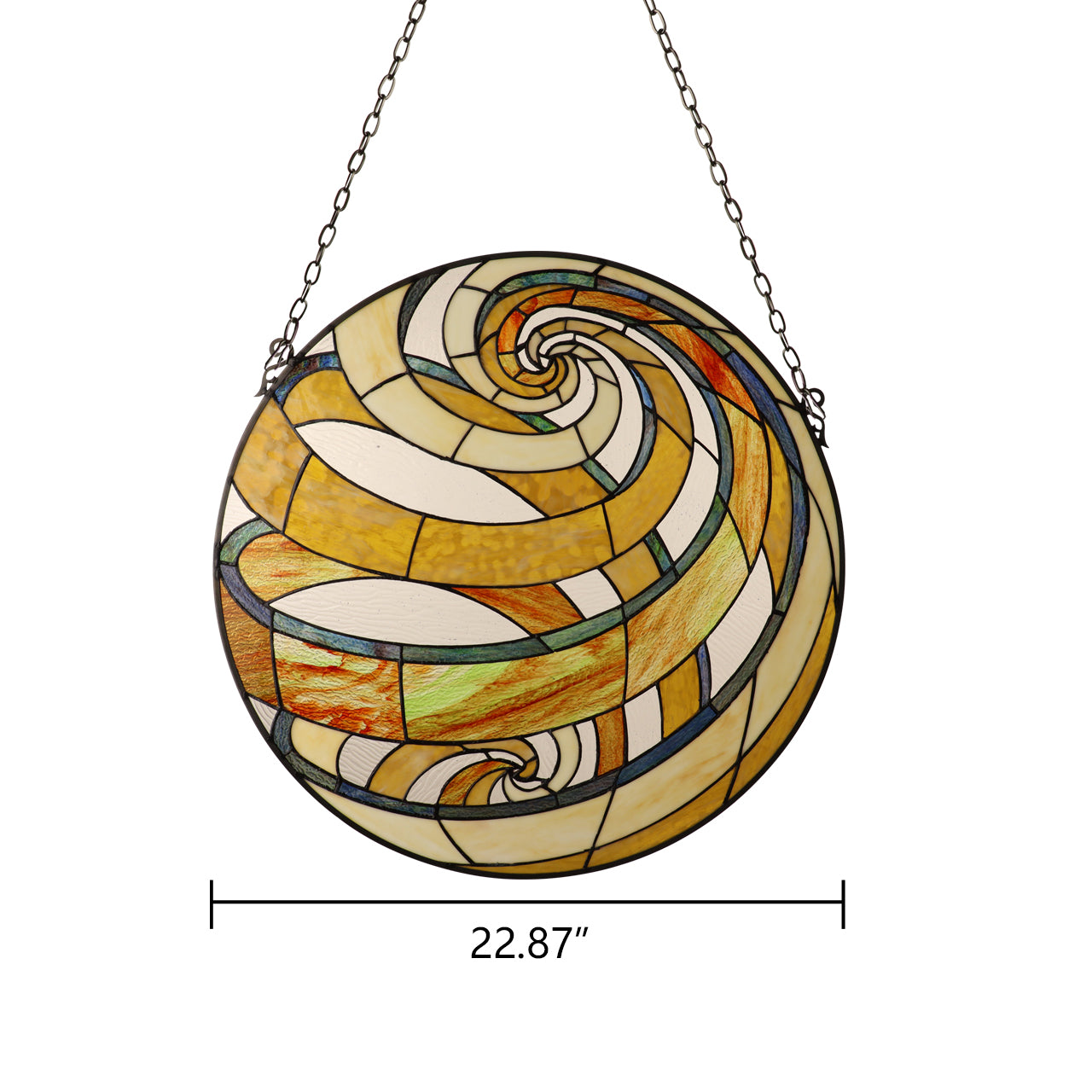 This is a gorgeous geometric style tiffany-glass window panel, is an excellent addition for any home. Terra, named for the orange swirls that resemble planet earth's deserts, will bring a sense of peace and calm whenever the sun shines through! The hand crafted Tiffany panel is made up of 119 pieces of hand cut, stained art glass, expertly pieced and soldered together, to create each panel. Each of our Tiffany-style stained glass panels are formed using the very same technique developed by Louis Comfort Tiffany in the early 1900's, using hand cut stained art glass, each wrapped in fine copper foil and soldered together at extremely high temperatures to form each unique panels. Exact size to the nearest inch may vary, and exact color of each glass piece may vary due to each piece being hand crafted. First image is with the light shining through, second image is with no light. Dry listed and recommended for an indoor setting. Thank you for choosing Radiance Goods, proudly serving you from the US!