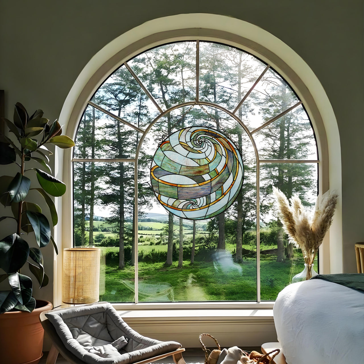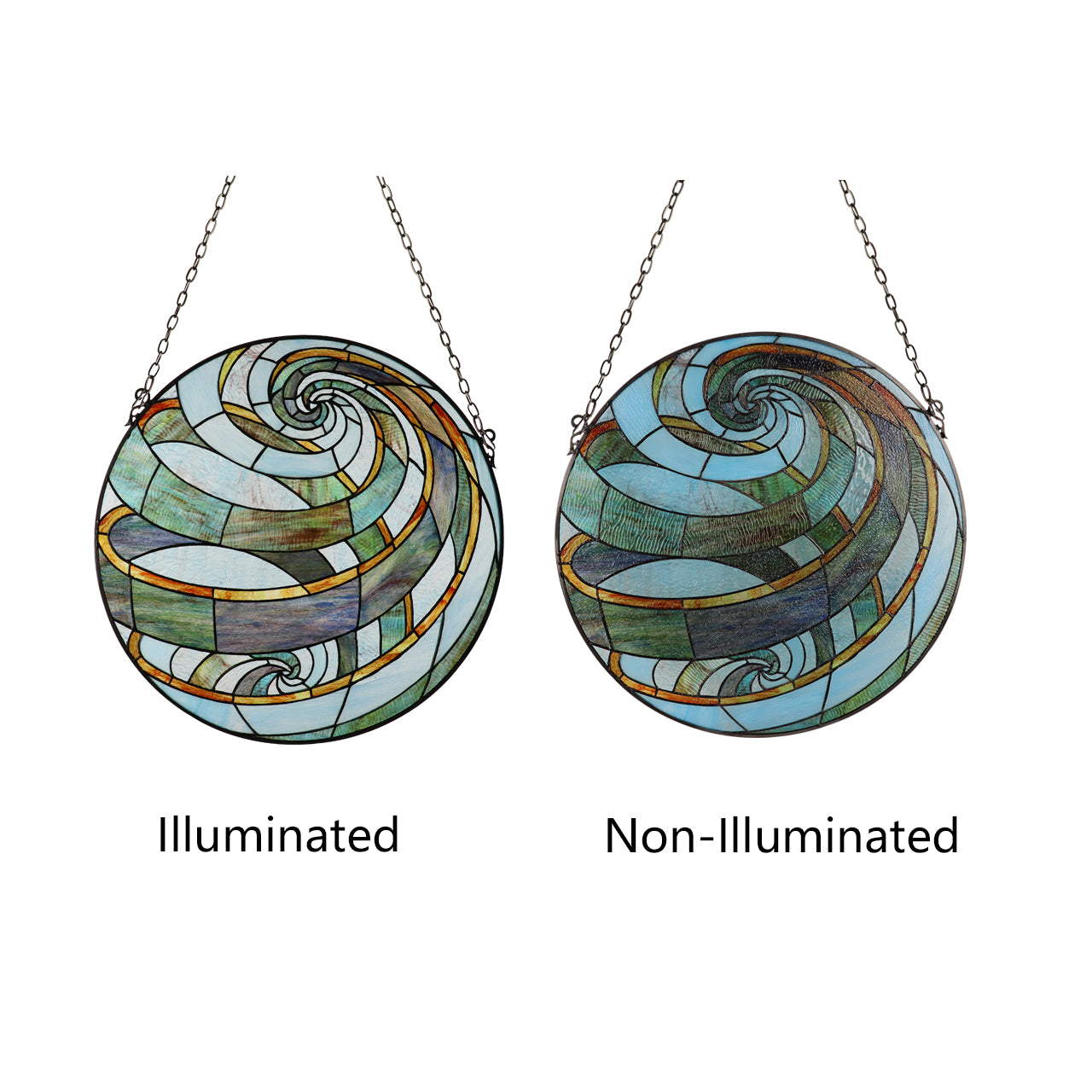 This is a gorgeous geometric style tiffany-glass window panel, is an excellent addition for any home. Terra, named for the green and blue swirls that resemble planet earth, will bring a sense of peace and calm whenever the sun shines through! The hand crafted Tiffany panel is made up of 119 pieces of hand cut, stained art glass, expertly pieced and soldered together, to create each panel. Each of our Tiffany-style stained glass panels are formed using the very same technique developed by Louis Comfort Tiffany in the early 1900's, using hand cut stained art glass, each wrapped in fine copper foil and soldered together at extremely high temperatures to form each unique panels. Exact size to the nearest inch may vary, and exact color of each glass piece may vary due to each piece being hand crafted. First image is with the light shining through, second image is with no light. Dry listed and recommended for an indoor setting. Thank you for choosing Radiance Goods, proudly serving you from the US!