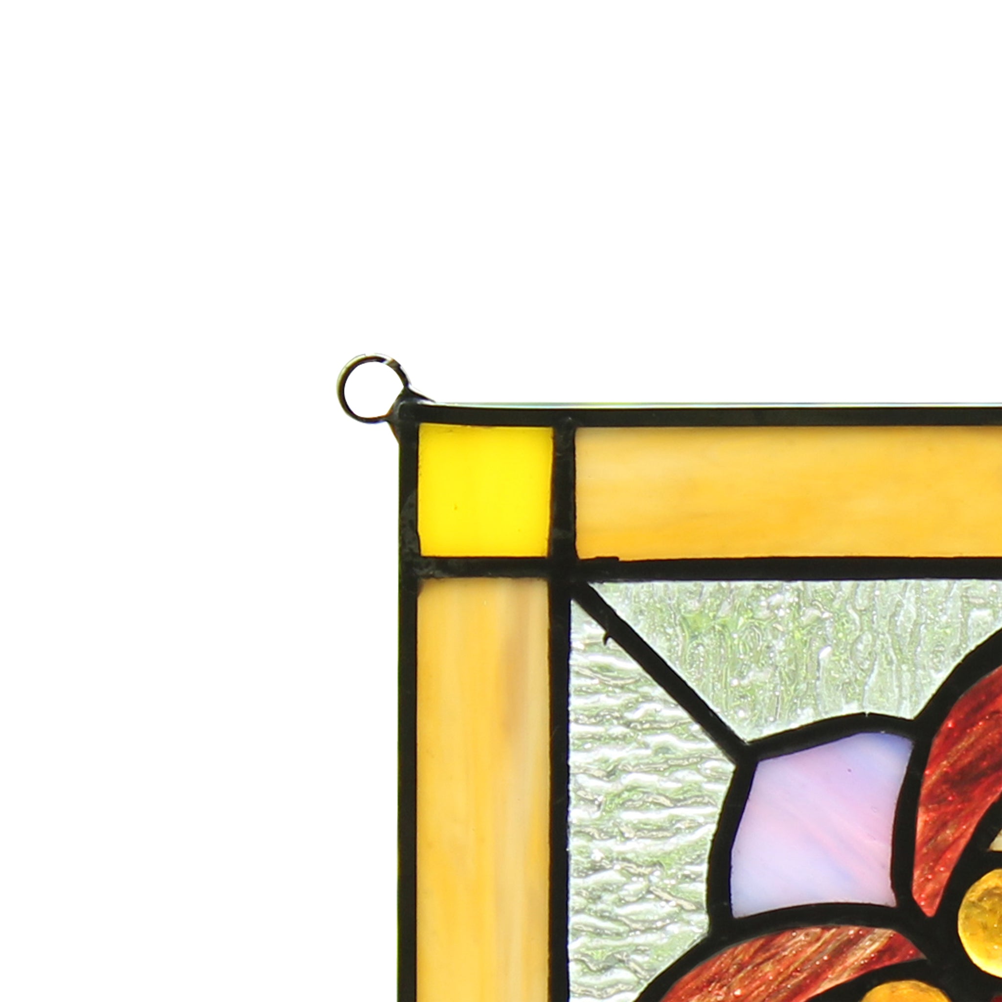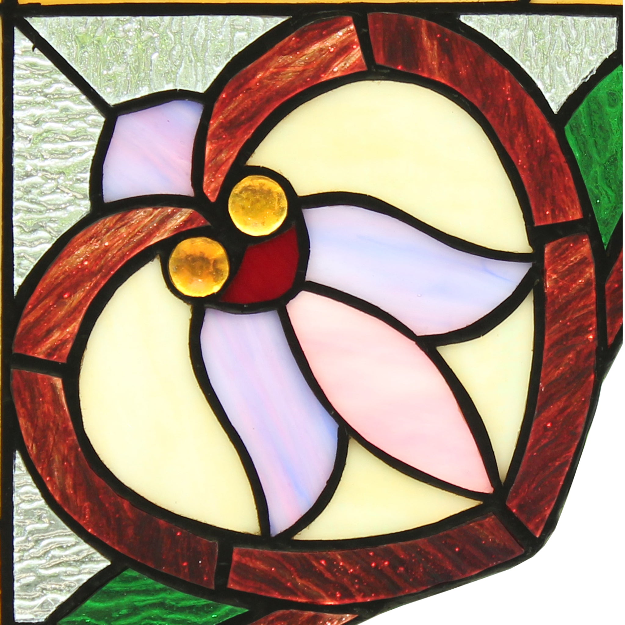 This Victorian style stained glass window panel features a beautiful old-fashioned design, sure to compliment your home. Handcrafted from over 35 pieces of art glass and 4 glass beads. Main color is rosy-pink. Handcrafted using the same techniques that were developed by Louis Comfort Tiffany in the early 1900s, this beautiful Tiffany-style piece contains hand-cut pieces of stained glass, each wrapped in fine copper foil and soldered using high heat. Dry listed and recommended indoor use only. Thank you for choosing Radiance Goods, proudly serving you from the US!