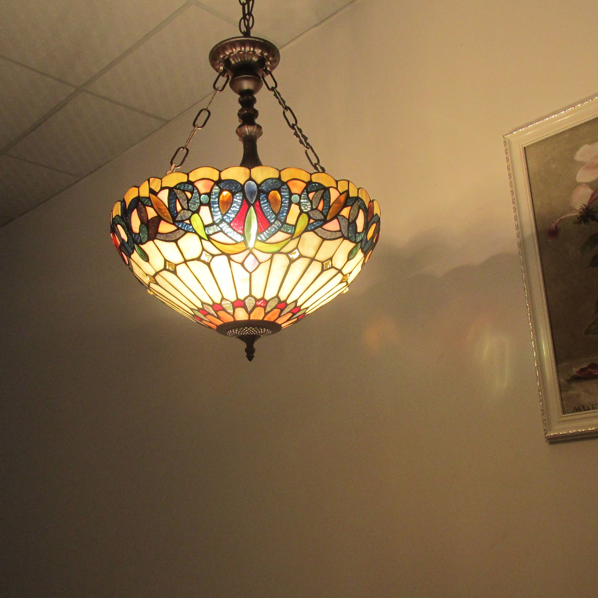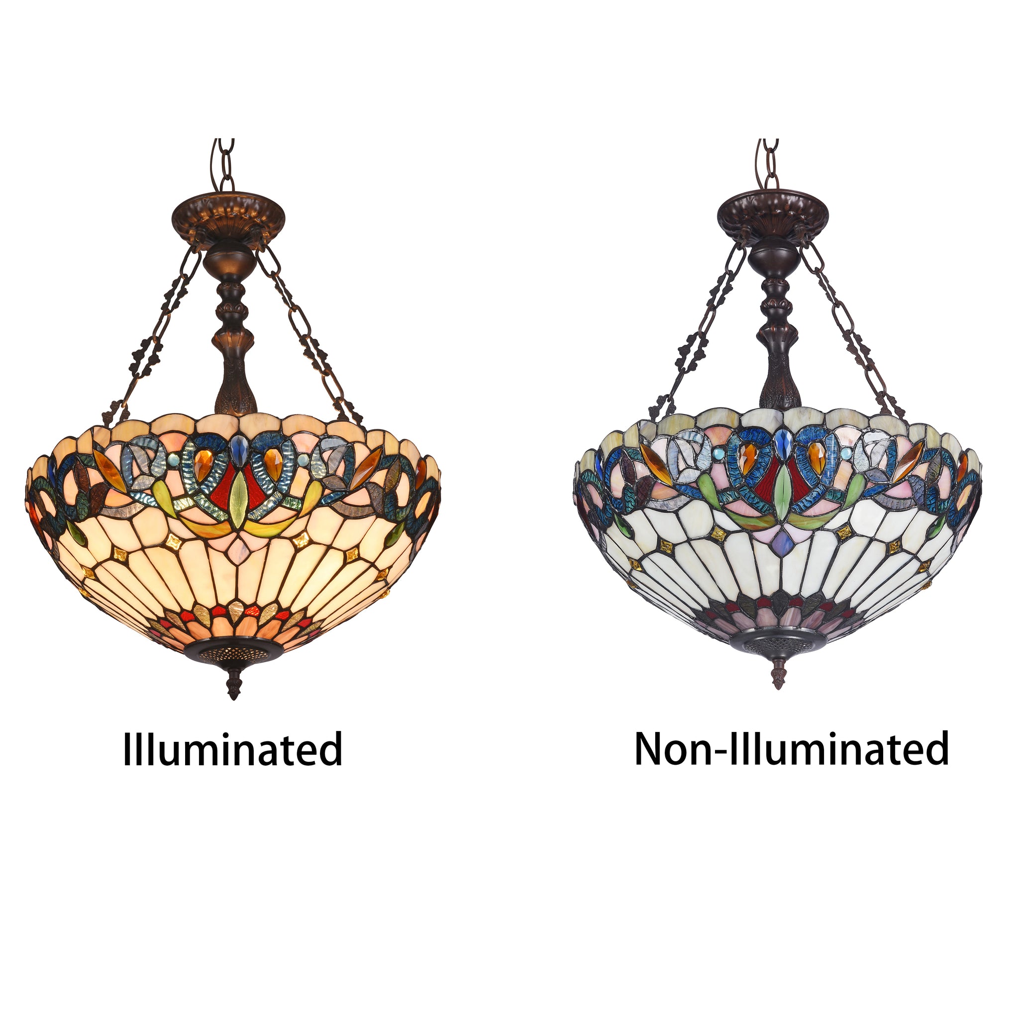 This Victorian style 3-light inverted ceiling pendant features a stained and hand-cut glass shade, with a beautiful old-fashioned design. Hand crafted from over 320 pieces of art glass, 80 glass beads and 24 crystals. Main colors are white, blue, green and orange. Handcrafted using the same techniques that were developed by Louis Comfort Tiffany in the early 1900s, this beautiful Tiffany-style piece contains hand-cut pieces of stained glass, each wrapped in fine copper foil and soldered using high heat. Dry listed and recommended indoor use only.
