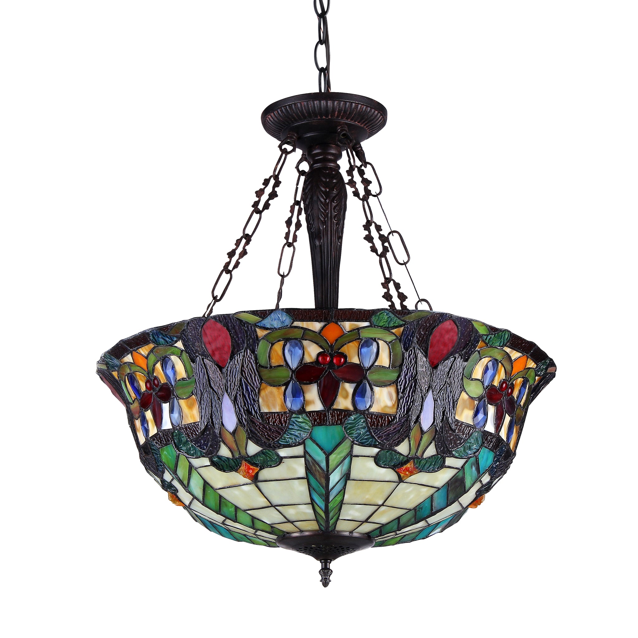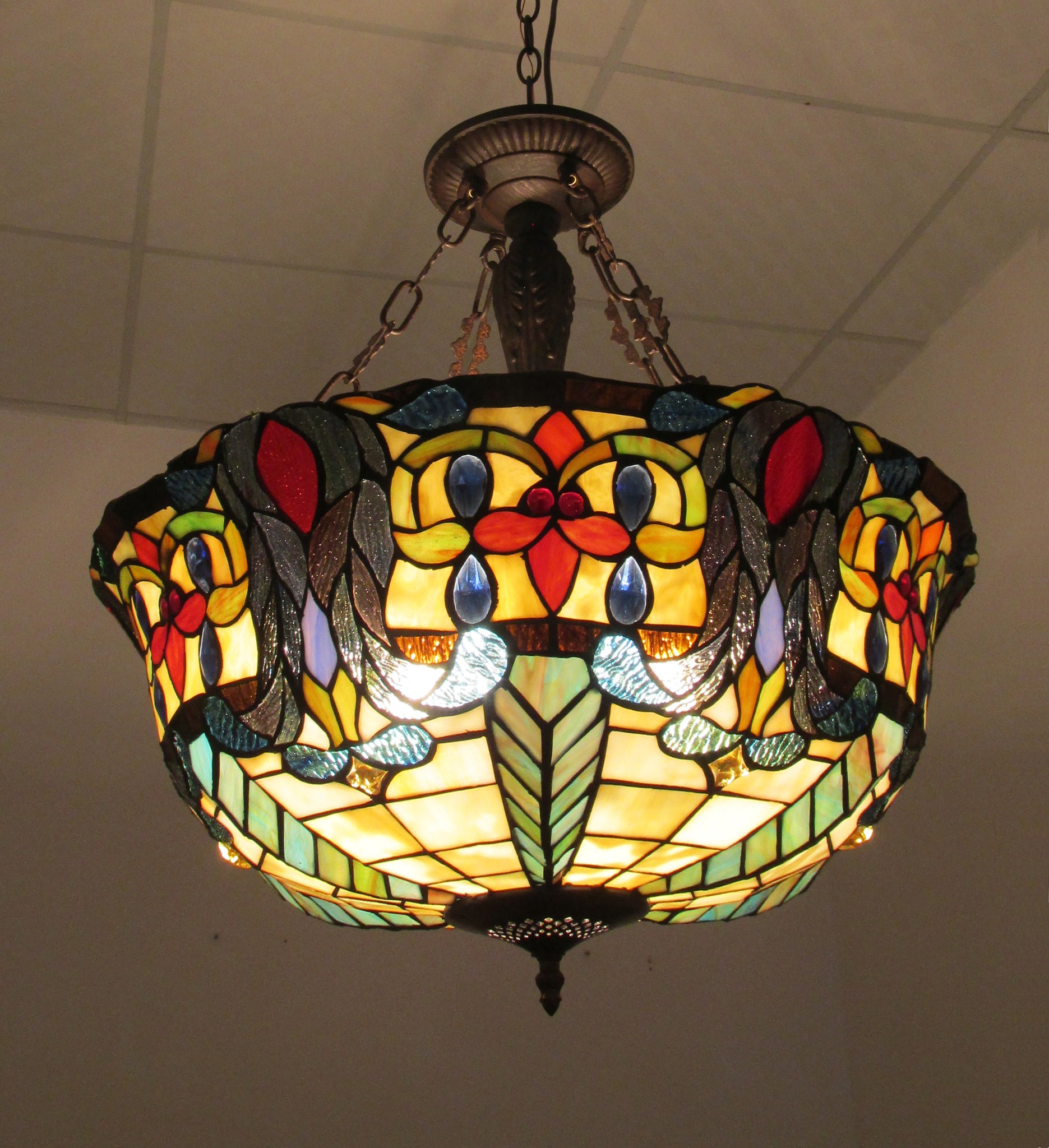 This delightfully detailed inverted hanging pendant lamp will become the design focal point of any room, enhancing any décor. Flower blossoms are highlighted along the scalloped edge in the high density stained glass shade, offset with gem-like cabochons. Expertly handcrafted with top quality materials and finished in an antique bronze patina. Handcrafted using the same techniques that were developed by Louis Comfort Tiffany in the early 1900s, this beautiful Tiffany-style piece contains hand-cut pieces of stained glass, each wrapped in fine copper foil and soldered using high heat. Dry listed and recommended indoor use only.